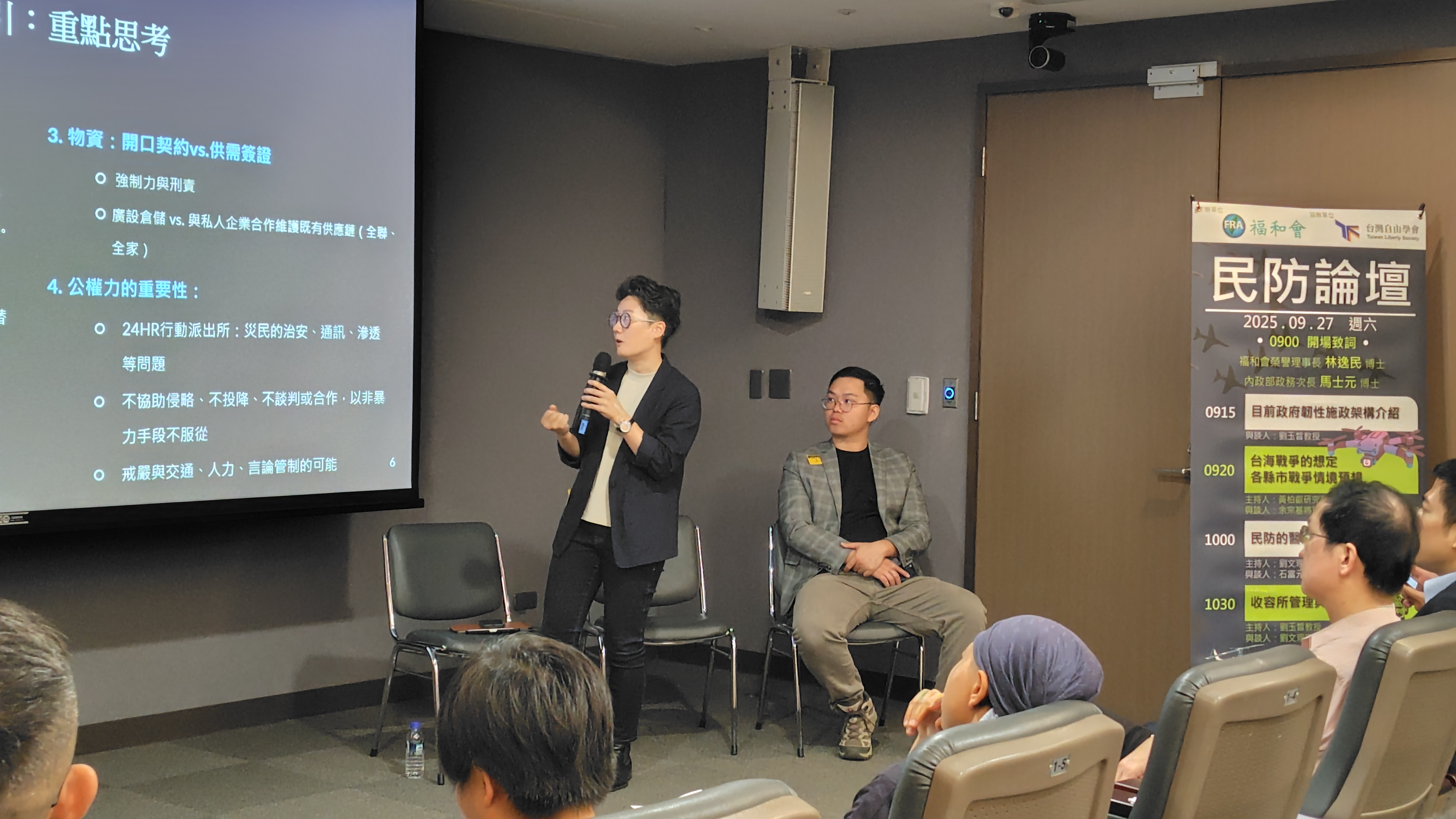 時代力量副秘書長劉品辰表示,左派觀點關注壓迫結構下的個體處境,必須反對國家暴力、種族隔離,並支持平民生存尊嚴,若臺灣強調自決權,也應關注他者民族在受壓迫情境下的自決與尊嚴。劉品辰提醒,面對川普上任等國際環境變化,價值外交執行難度升高,台灣外交須在價值與現實間取得平衡,既要堅守原則,也要防範外部威權勢力利用資訊戰來撕裂社會。他最後總結,若臺灣面臨侵略,盼國際支持不僅基於戰略與產業價值,也能基於對共同人性與價值的認同。